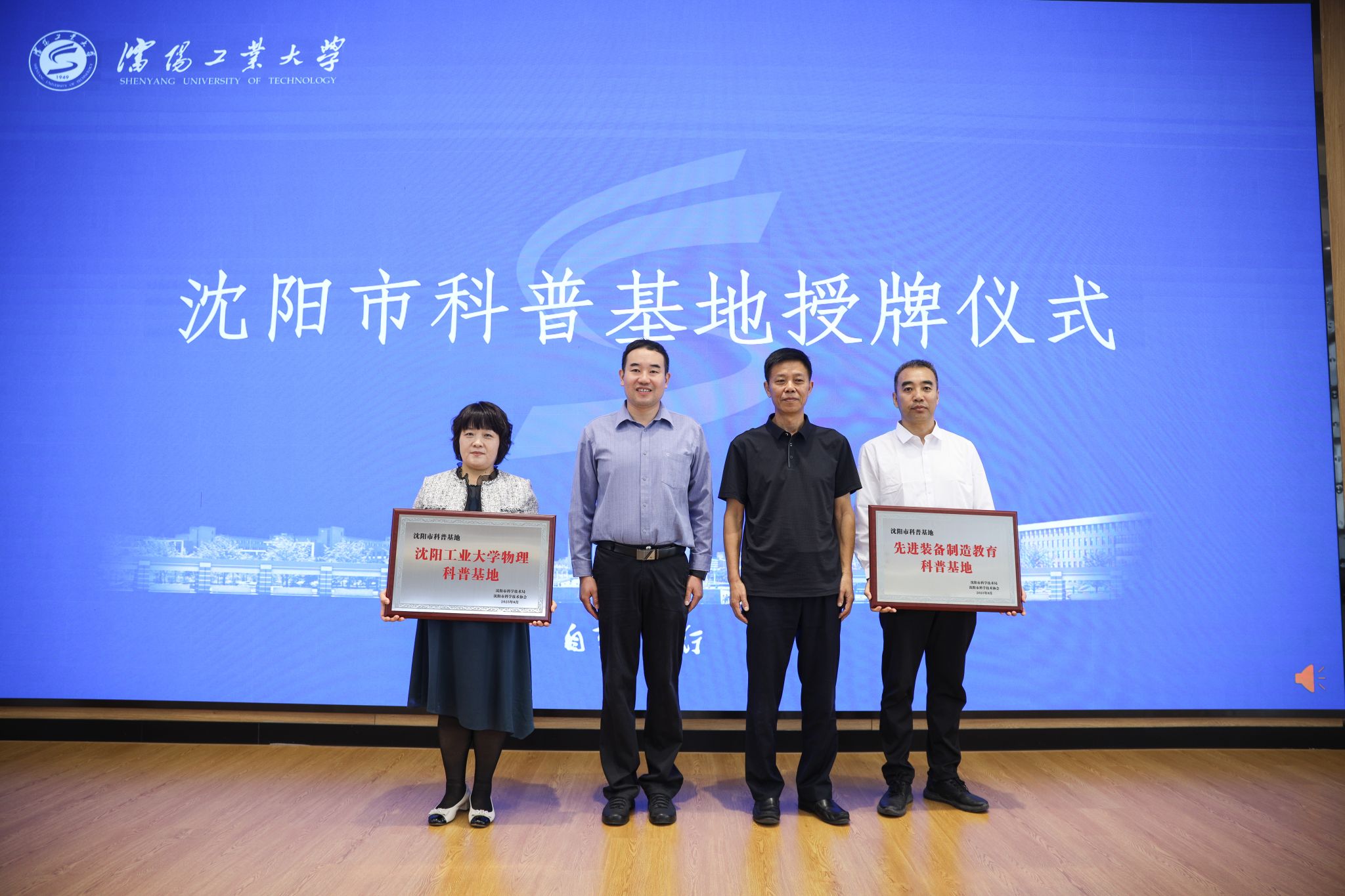 仪式上,鞠楠、赵宇为国产高清在线精品一区二区三区授予沈阳市“先进装备制造教育科普基地”和“物理科普基地”牌匾。
